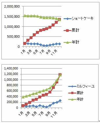 緑のグラフの1年間の売上累計の形がミルフィーユの方が上向きに上がっています。
