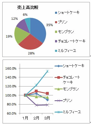 下段のグラフでは、ショートケーキとミルフィーユの売り上げ推移をグラフ化しています。