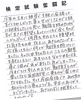 でも、毎日勉強していると、段々と出来るようになり面白くなってきました。合格できて本当に嬉しいです。これからも更に上級を目指して勉強したいと思います。先生方、ご指導下さりありがとうございました(^_-)-☆
